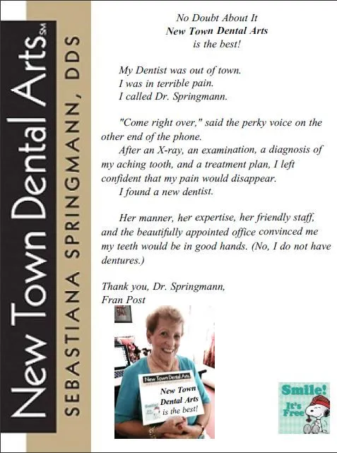 “We are not much in the photo department but, we want to have a chance to let others know how important New Town Dental Arts has been to us over the last 17 years. It seems Dr. Springmann was just a young girl when we met her, but we came to appreciate her knowledge, skill and dedication to her love of dentistry. She has gently taught us how crucial good dental care is to one's overall health. Like your eyes, your teeth have so many markers that tell about your total health.